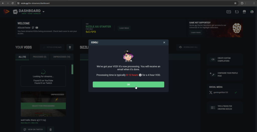 To access your VODs, you must link your Twitch or YouTube account to Sizzle.gg. This enables the platform to gather your streams and examine them for thrilling highlights.
